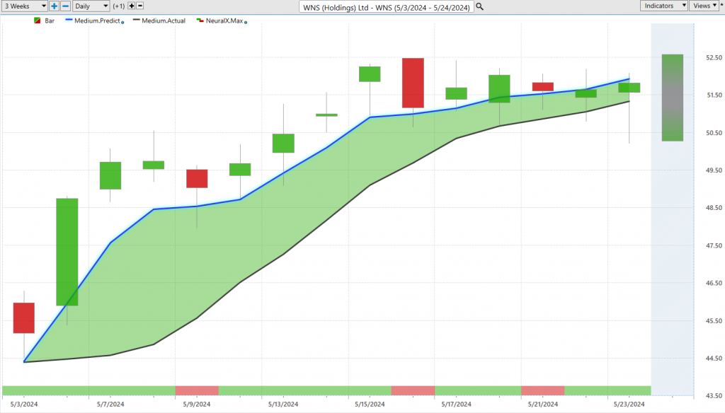 Here’s another opportunity here in WNS Holdings ($WNS). Again, just a good example of some of these things where we see this predicted moving average get a very quick crossover, and we’ve seen a really aggressive advance in the share price here. This is an example where we can see since that crossover has come through, you’ve got about a 12, almost 13% rally over the past 14 trading days. In this instance, we can zoom in a little closer on things like those Vantage Point predicted highs and lows. You see how this works as the market starts to advance. You’ve got a lot of distance between that predicted moving average and the actual moving average, and you can identify intraday levels to go ahead and accumulate a position. You see over the past couple of days moving down to the lower part of this range and the overall trend to the upside here, so potentially a nice opportunity here in WNS.