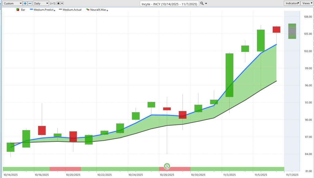 And so we have some really great examples of how really this suite of predictive indicators works together. Uh, and so we can start out here with Incyte (INCY) Pharmaceuticals. And so we have really about a month of data on the chart. We’ve got earnings right in the middle of the chart here. Uh, but what you’re first going to notice against all of these daily bars and candles is that there’s a black line and also a blue line value.