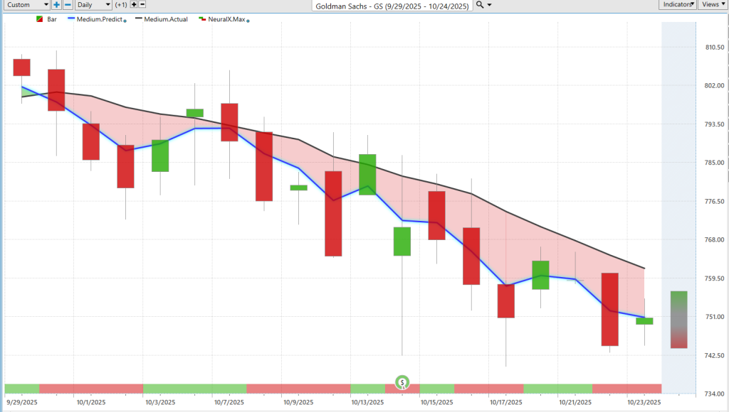 Here we see with Goldman Sachs (GS), the stock very clearly shows the blue line crossing below the black line—again, one of these instances where the neural index gets bullish within a downtrend.