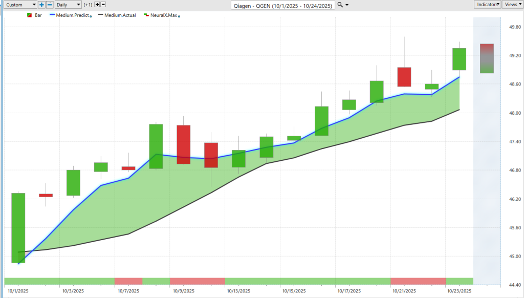 Here’s QGEN (Qiagen)—a good example again of how all of these tools work together. The predicted moving average moves above the actual moving average, neural index very bullish, but then we move down to a red configuration and run into sideways price action with subsequent 48-hour periods where that neural index goes bearish.
